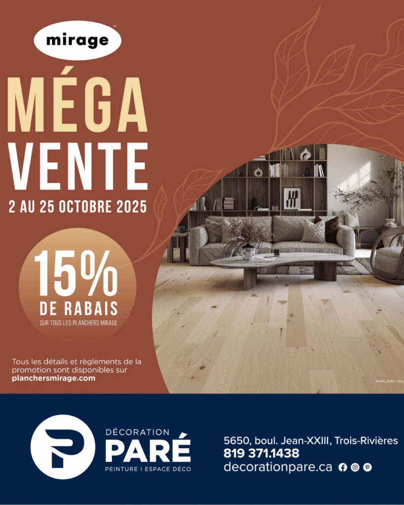 Du 2 au 25 octobre 2025, profitez de notre grande promotion Mirage chez Décoration Paré, Trois-Rivières :